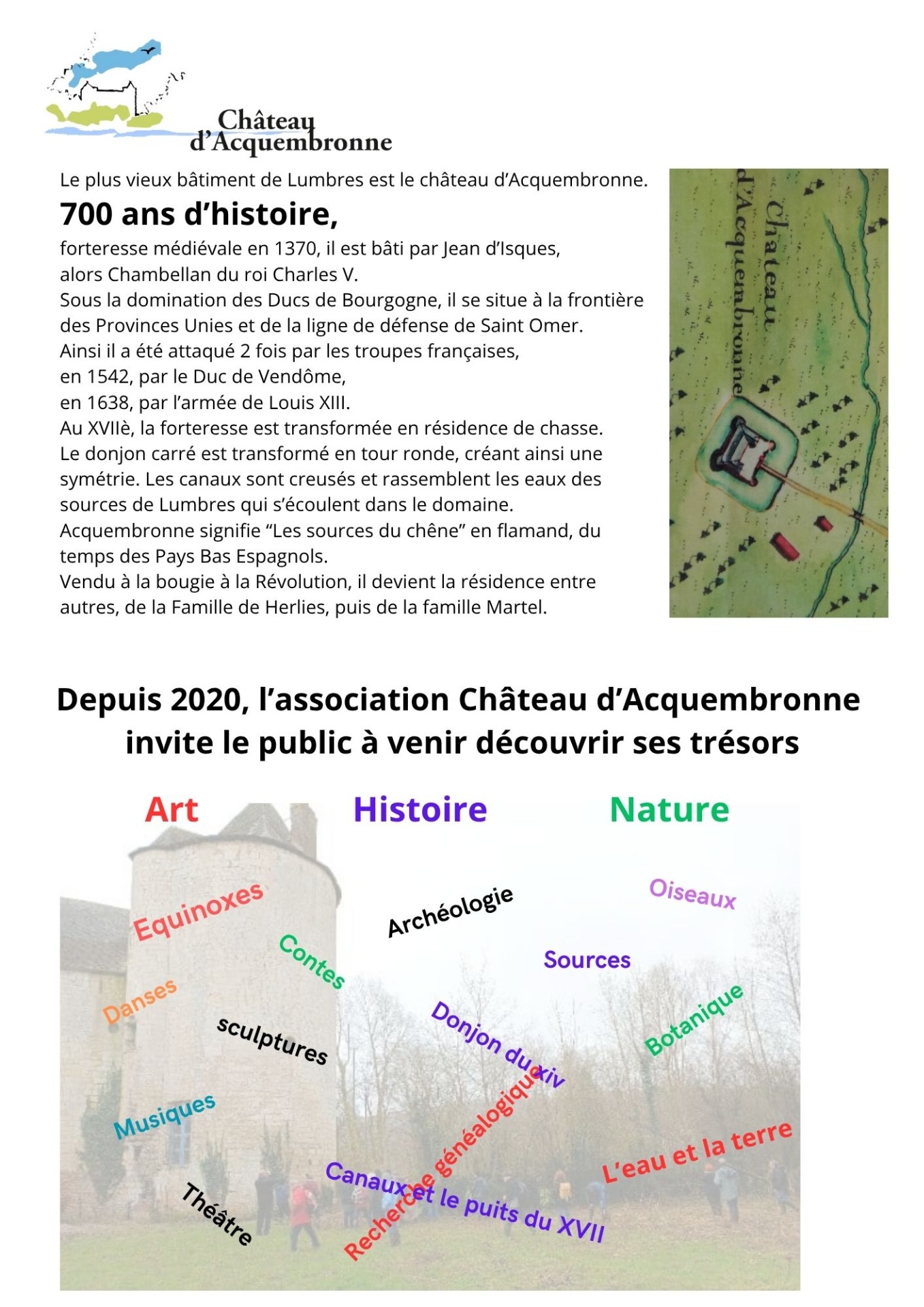 Le hameau de Liauwette, à Lumbres, préserve jalousement un des rares témoins de l'architecture du Moyen-âge dans la vallée de l'Aa. À la fois monumental et discret, le château d'Acquembronne a résisté aux guerres et aux aléas du temps, préservant de chaque époque un pan de son histoire. Des noms célèbres ont foulé ses planchers, tels les d'Isque qui l'ont conçu au XIVe siècle, les Beauffort, Sandelin ou Deherly. Ils en ont fait tour à tour un château fort, une résidence noble, un domaine agricole, une maison de campagne... Au terme de 700 ans d'évolution, ses murailles de pierre et sa terre riche de multiples sources, nous livrent aujourd'hui un ensemble étonnamment harmonieux.